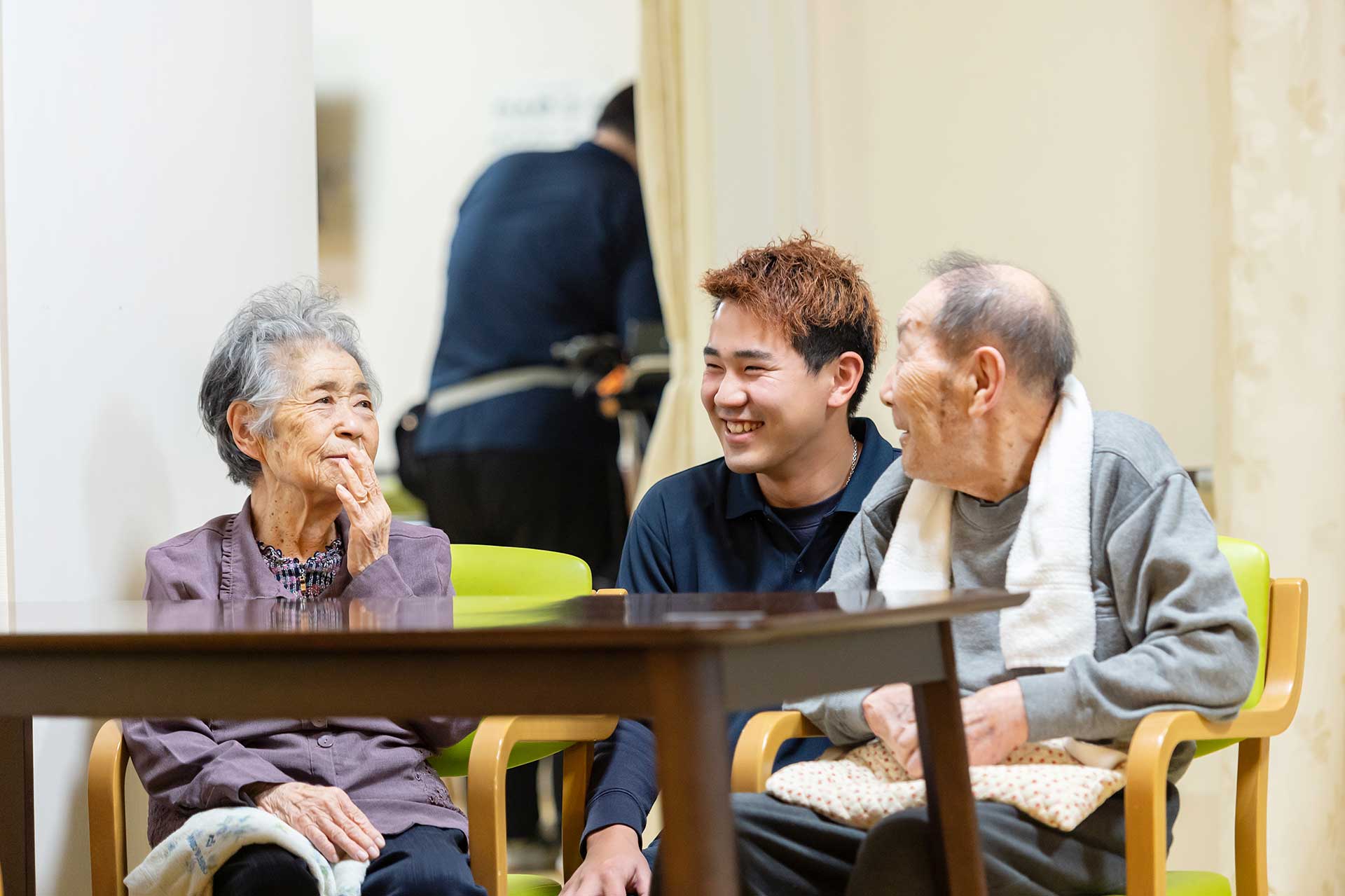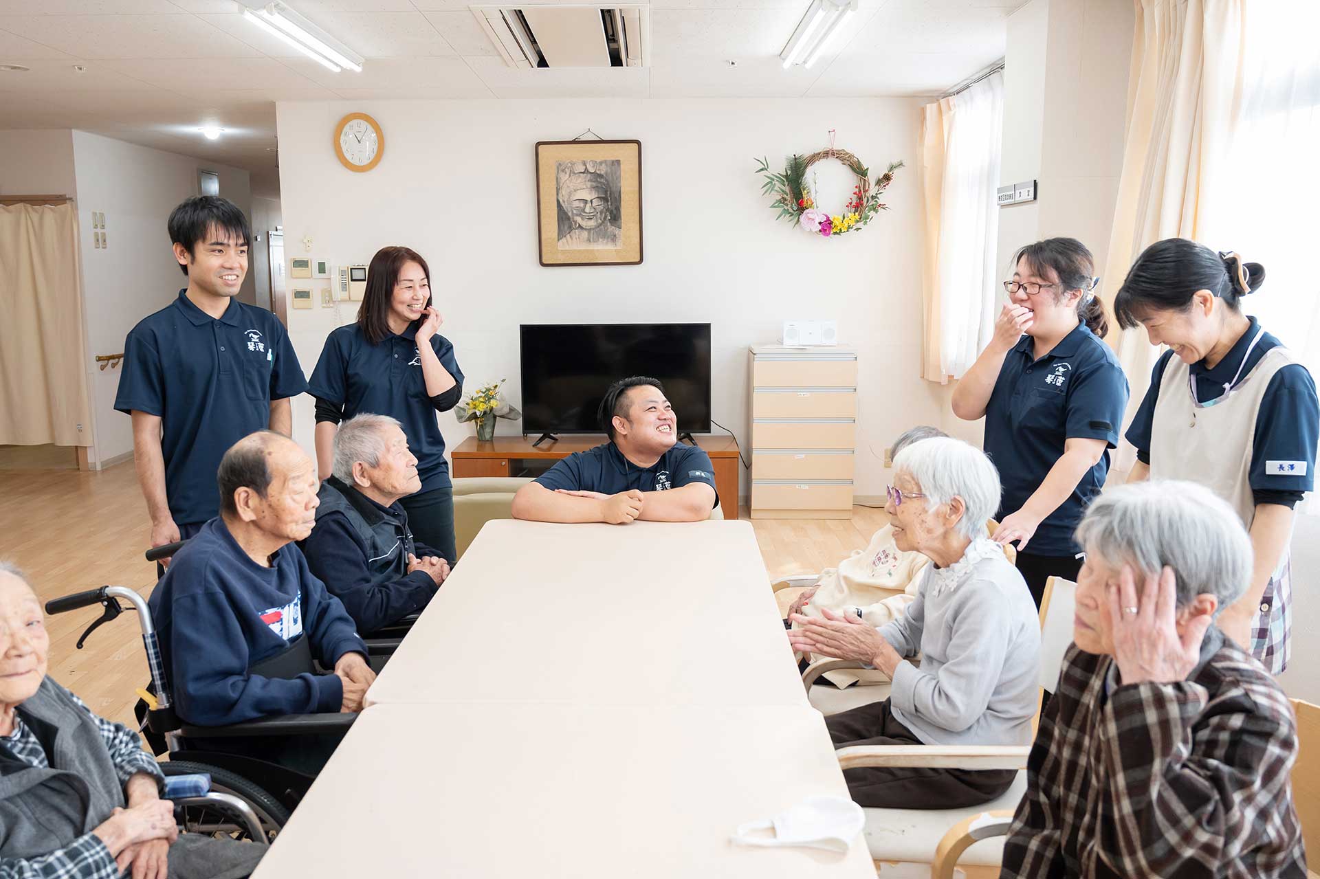 琴葉独特のアットホームな雰囲気は、会社設立から根付いている特徴的なもの。それはそれぞれの立場に縛られない自由な会社の風潮が、その雰囲気を作り出しています。スタッフは利用者様のお世話をするのが仕事ですが、利用者様のほとんどは様々な経験を積まれてきた人生の大先輩。利用者様のその大きな存在に逆に助けられていることも多いのです。そこにはスタッフと利用者様という関係以上に、人と人、一緒に日々を暮らす仲間であること。まるでひとつの家族のように毎日楽しく過ごせる雰囲気は琴葉最大の特徴です。